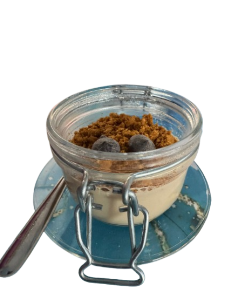 Panna cotta al caffe', crumble di lotus biscoff e cioccolato fondente.